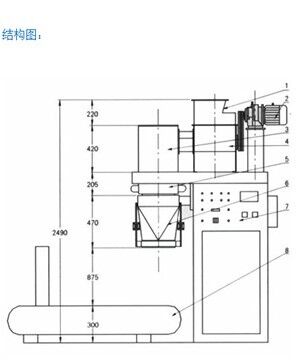 1.進(jìn)料口 2.絞龍電機(jī) 3.控制器 4.給料器 5.除塵罩 6.夾袋式電子秤 7.電控柜 8.輸送縫包系統(tǒng)